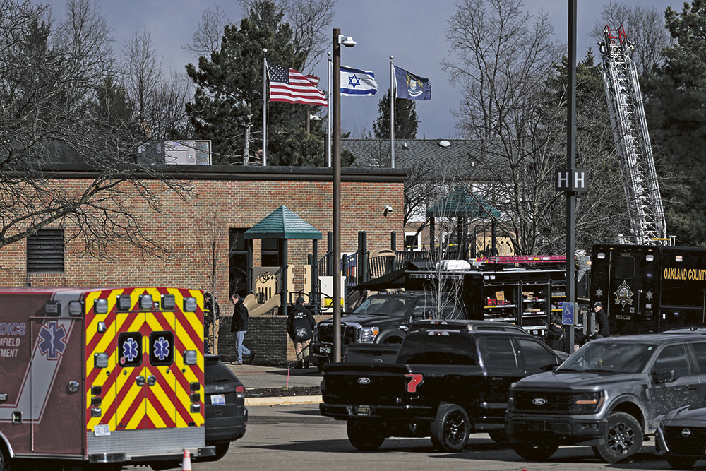 Polizeifahrzeuge auf dem Parkplatz des Temple Israel, während eine israelische Flagge auf dem Dach des Gebäudes im Wind weht, nach einem Amoklauf in West Bloomfield, Michigan, am 12. März 2026. © EMILY ELCONIN / GETTY IMAGES NORTH AMERICA / GETTY IMAGES VIA AFP